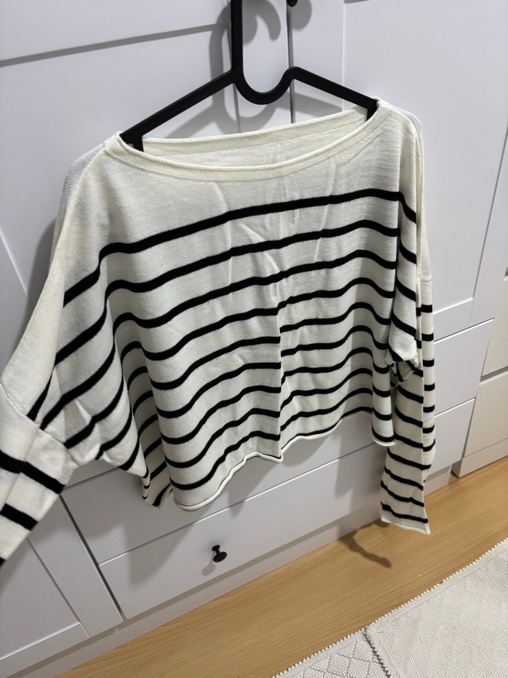 gevşek kesim, uzun kollu, tekne yaka ve çizgili desenli triko kazak. Rahat ve gündelik sokak stili için uygundur.