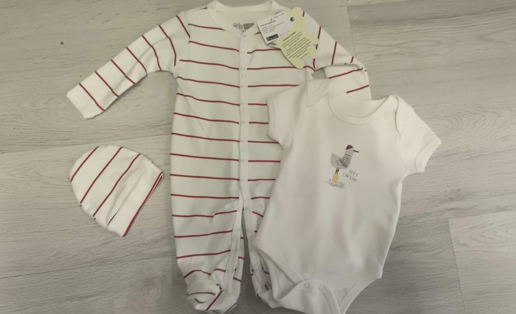Pamuklu, beyaz zemin üzerine kırmızı çizgili düğmeli ve kısa kollu, baskılı detaylı tulum zıbın şapka bebek seti. 0-3-6-9 aylar mevcuttur beden belirtiniz