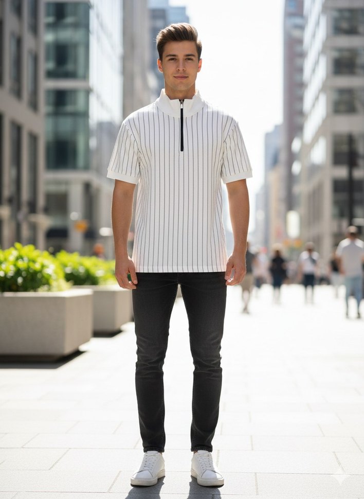 Erkekler için beyaz ve gri çizgili denim kumaştan, yarım fermuarlı yüksek yakalı, kısa kollu, regular fit tişört. Sokak stiline uygun rahat bir parça.