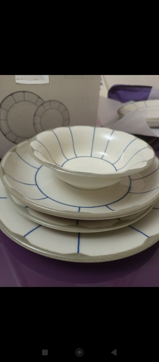 İnce mavi çizgili beyaz tabak ve kase seti, yemek servisi için uygundur. Basit ve şık tasarıma sahiptir. ️