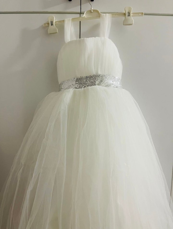 Beyaz çocuk abiye elbise, straplez kesim, drapeli katmanlar ve gümüş payet kemer ile modern klasik tarzda tasarlanmıştır. ✨