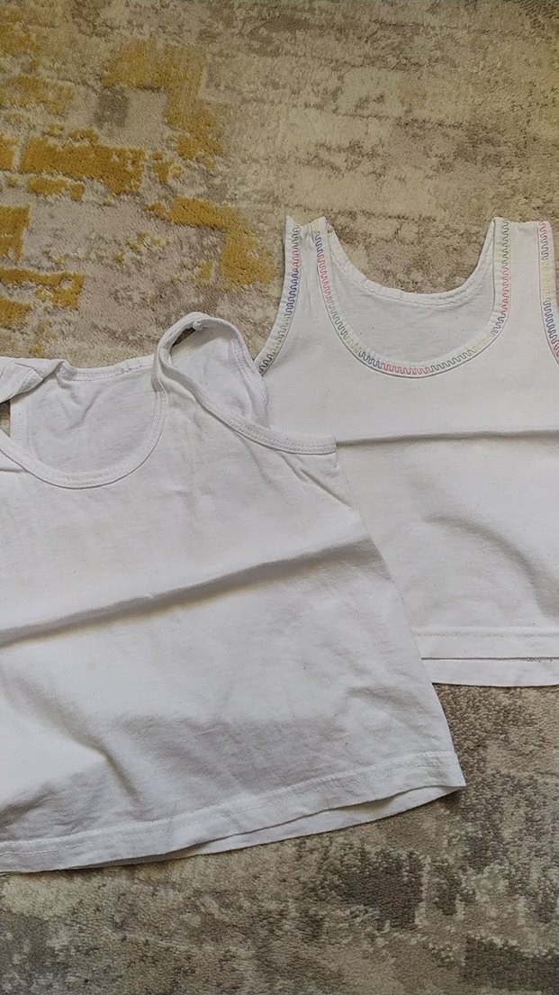 Yumuşak kumaştan iki beyaz çocuk atlet, biri pastel renkli detaylara sahip. Rahat ve sade tasarım.