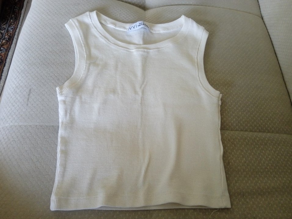 Yumuşak kumaştan yapılmış beyaz, kolsuz çocuk atleti. Rahat ve sade tasarım.