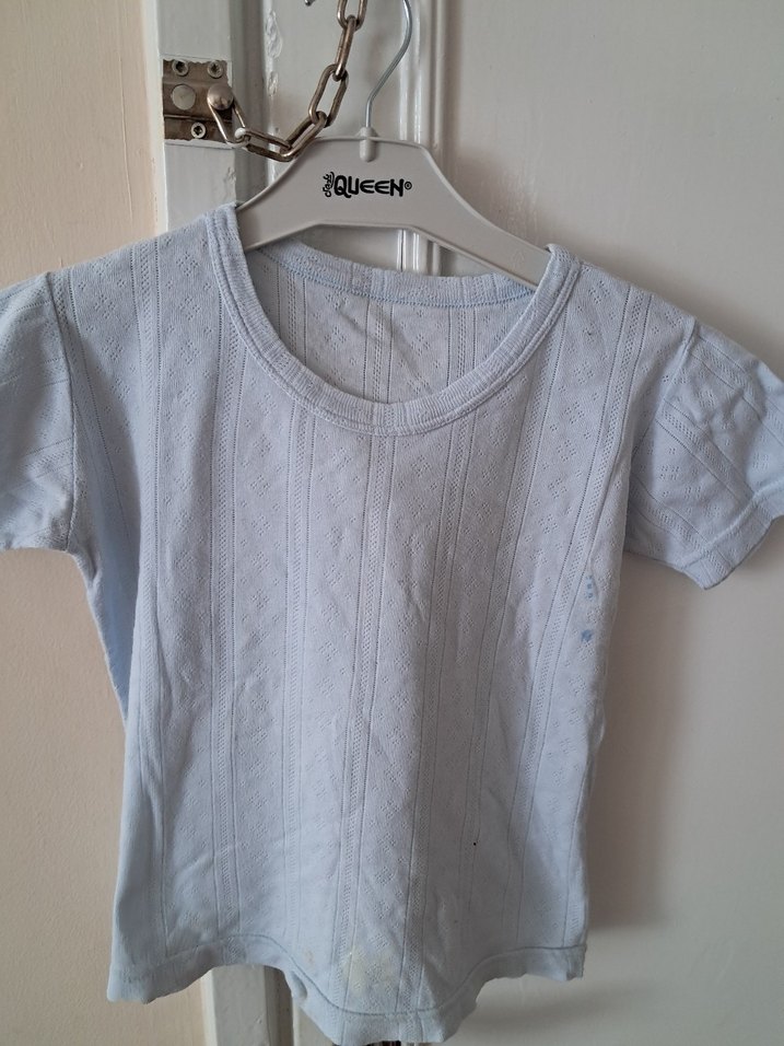 Yumuşak beyaz renkli, kısa kollu çocuk atlet, hafif dokulu desene sahip. Askıda QUEEN° markası yer alıyor.