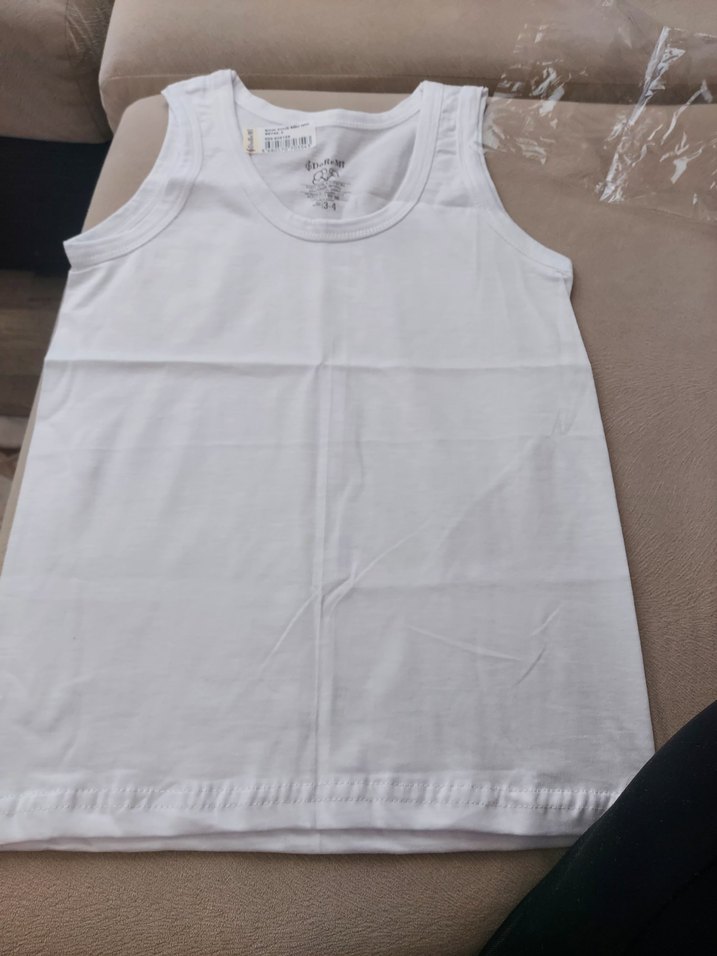 Yumuşak kumaştan yapılmış, kolsuz ve desensiz beyaz çocuk atlet.
