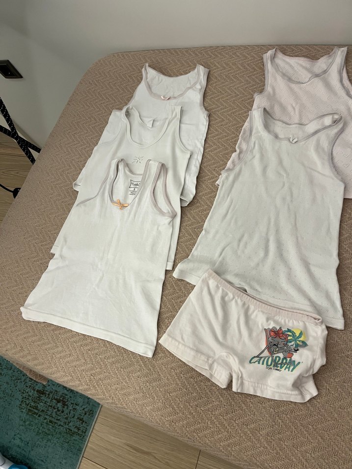 Çocuklar için beyaz, yumuşak ve rahat kumaştan yapılmış birden fazla kolsuz atlet ve renkli çiçek desenli açık renk şort seti. 5atlet ve boxer