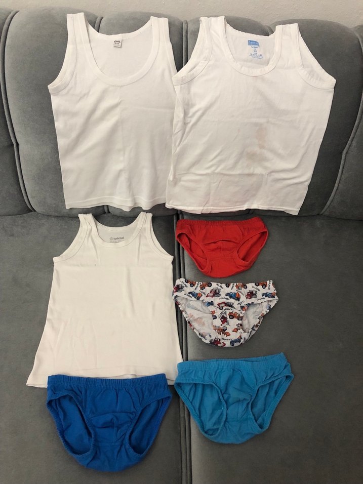 Çocuklar için beyaz askılı atletler ve çeşitli renklerde sade külotlar içeren set. Hepsi70 tl