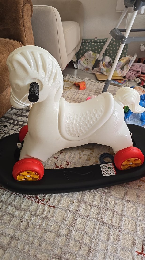 Beyaz renkte çocuklar için atlı oyuncak, kırmızı tekerlekleri ve siyah tabanıyla dayanıklı yapıya sahip.
