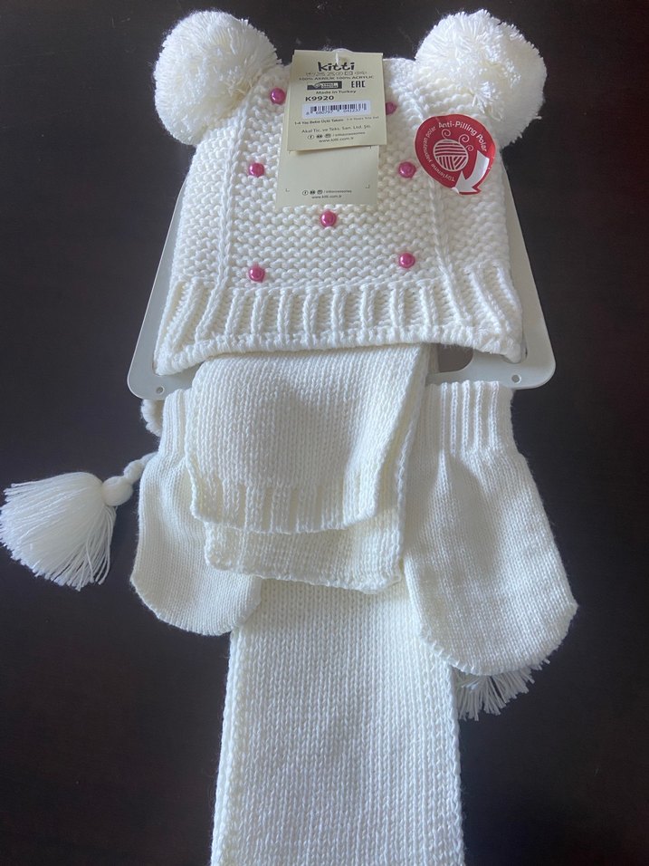 Beyaz çocuk bere, ponponlu ve boncuk detaylı, atkı ve eldiven setiyle birlikte❄️❄️❄️