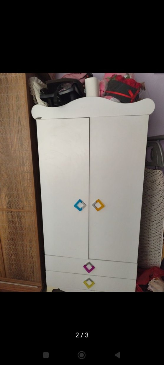 Renkli kulplu, iki kapaklı ve iki çekmeceli beyaz çocuk dolabı.