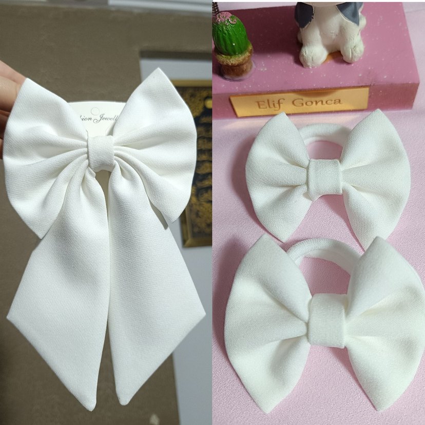krep kumaştan yapılmış, modern klasik tarzda, pastel renkte ve desensiz beyaz çocuk fiyonkları.