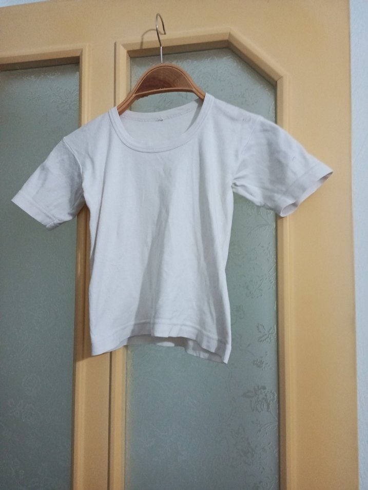 Kısa kollu, desensiz beyaz çocuk iç tişörtü. Günlük kullanım için yumuşak kumaştan üretilmiştir. iki koltuk arası 32 cm boyu 39 cm. Ölçülerini dikkate alın .3-4 yaşa uygun.Hafif grileşme var.İki koltuk altı tamir gördü . Arkasında çok küçük bir deliği ve çok hafif bir lekesi var son resimlerde gösterildi