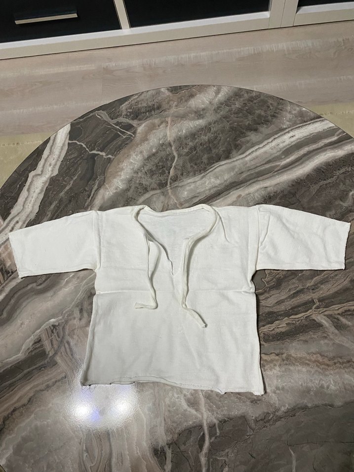 Uzun kollu, yumuşak kumaştan beyaz çocuk iç tişörtü. Düz ve desen içermeyen, ön kısmında bağcıklı açıklık bulunur.