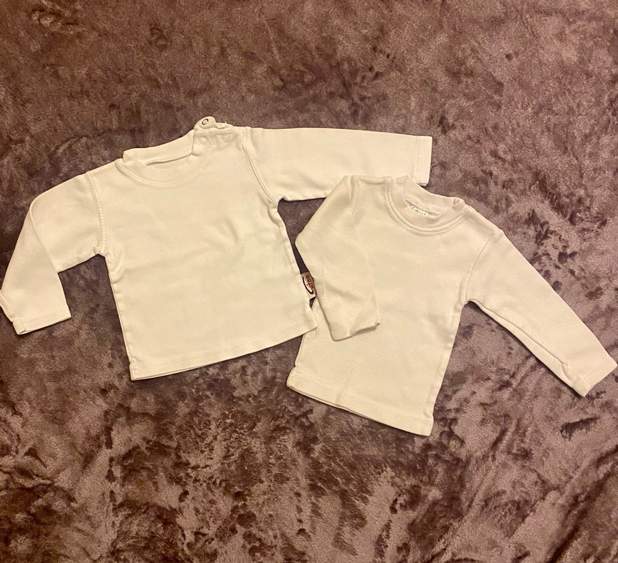 Yumuşak kumaştan yapılmış, biri omuz düğmeli iki beyaz çocuk içlik. Rahat ve sade tasarım çocuklar için.
