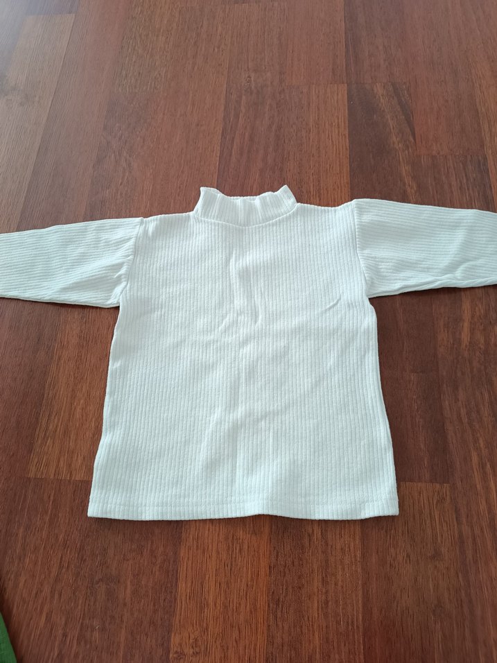 Yumuşak dokulu, yarım balıkçı yakalı beyaz çocuk kazak. Desensiz ve pastel tonlarda.