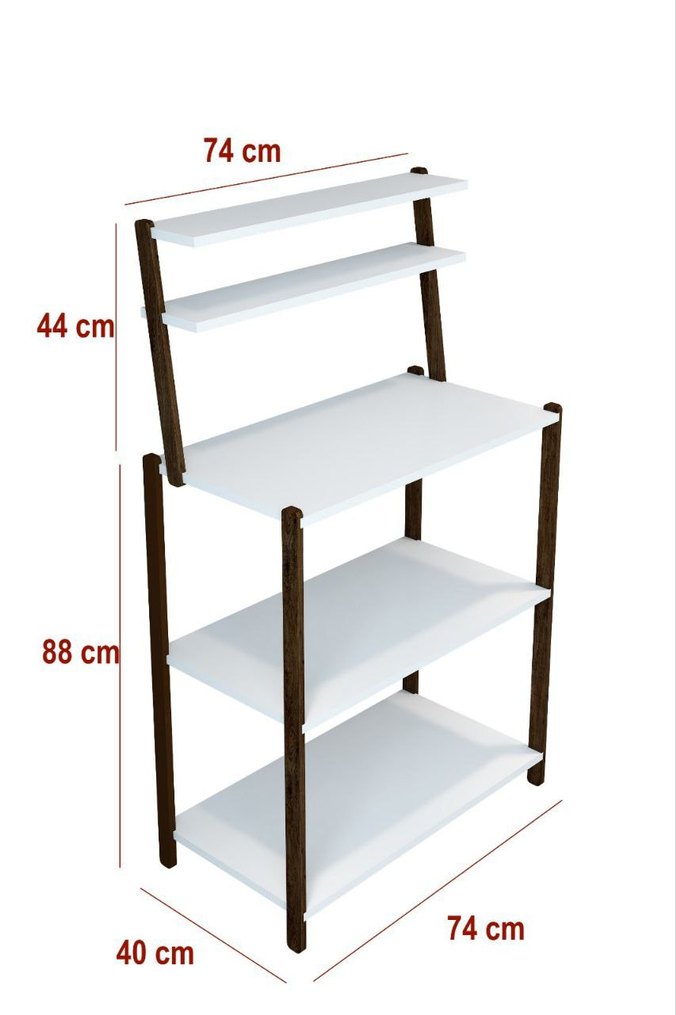 Beyaz çocuk raf ünitesi, koyu renk desteklerle çok katmanlı depolama sunar. Ölçüleri 74x40x88 cm, çocuk eşyalarını düzenlemek için uygundur.