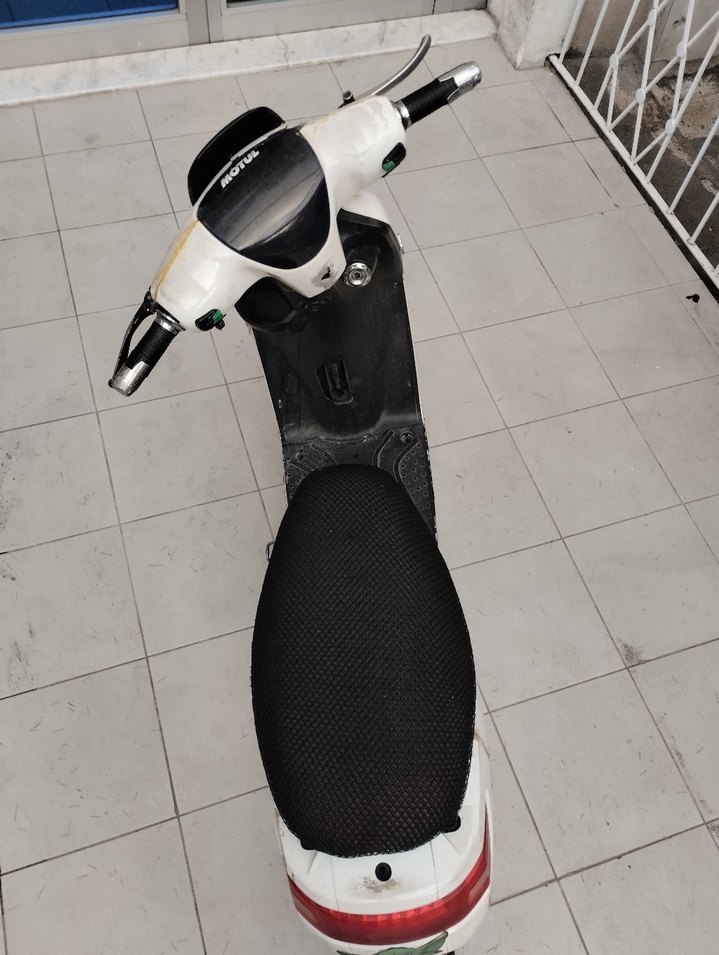 Beyaz gövde ve koyu renkli tutma kollarına sahip çocuk scooter'ı, konfor için dokulu siyah bir oturma alanı sunar. Dayanıklı yapıya sahiptir.