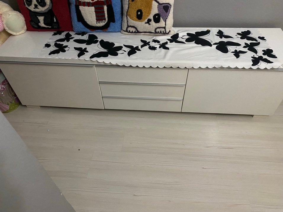 Üzerinde örtü ve yastıklar bulunan, çok çekmeceli beyaz çocuk şifonyeri.