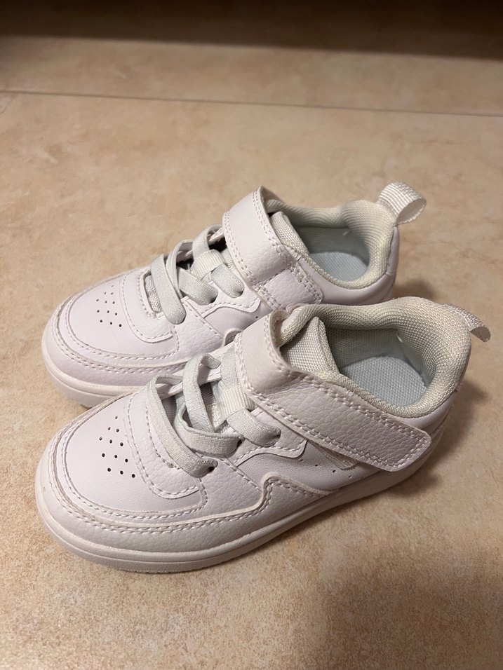 Beyaz renkte, Velcro bantlı ve kauçuk tabanlı, deri çocuk spor ayakkabısı, sade ve hafif görünümde, sokak stiline uygun.