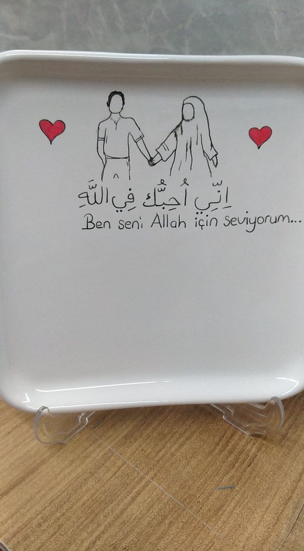 Beyaz renkte, üzerinde çift ve kırmızı kalpler bulunan, seramik tabak kişiye özel İSİM yazılır ️