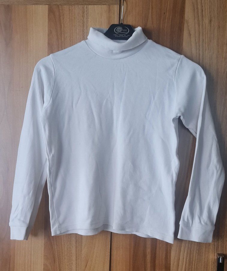 Beyaz renkli çocuk uzun kollu atlet, yumuşak ve düzgün dokulu kumaştan, yüksek yakalıdır. çocuk body iki kol altı arası 40cm boy 47cm belli belirsiz iki nokta var önünde ihtiyaç sahibi için
