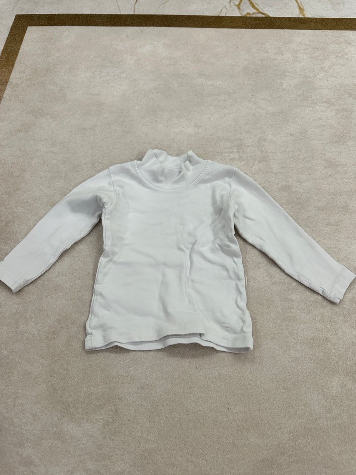 Beyaz renkte, uzun kollu ve yüksek yakalı çocuk atleti, yumuşak kumaştan üretilmiştir. Katmanlama için uygundur. Boy 32 cm (4.ç) #bebek #giyim #kıyafet
