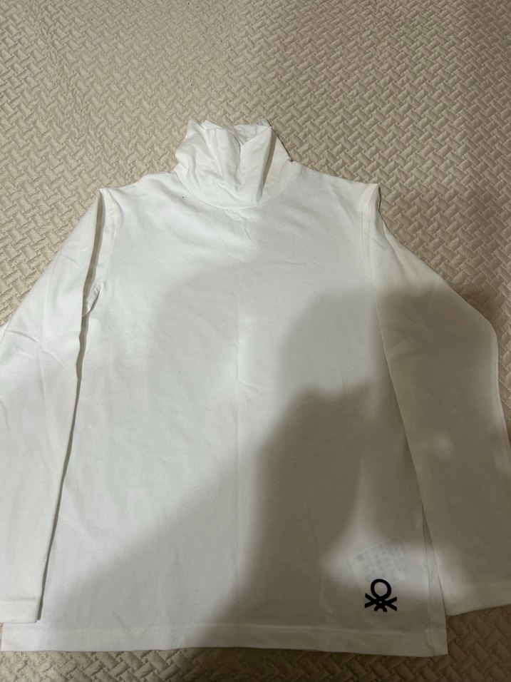 Beyaz, uzun kollu çocuk içliği, yumuşak ve pürüzsüz kumaştan. Alt kısmında küçük gri logo bulunur. Katmanlama için uygundur.