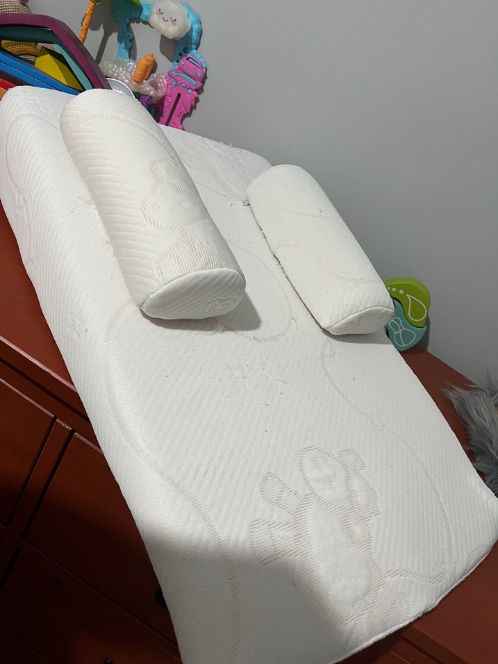rahatlık ve destek sağlayan beyaz çocuk yastığı seti, iki silindirik yastık içerir ilk iki ay müslin ile kullandım  fermuarlı çıkarılıp yıkanabiliyor  kustuğu dönemde çok rahat ettik sorunsuzdur