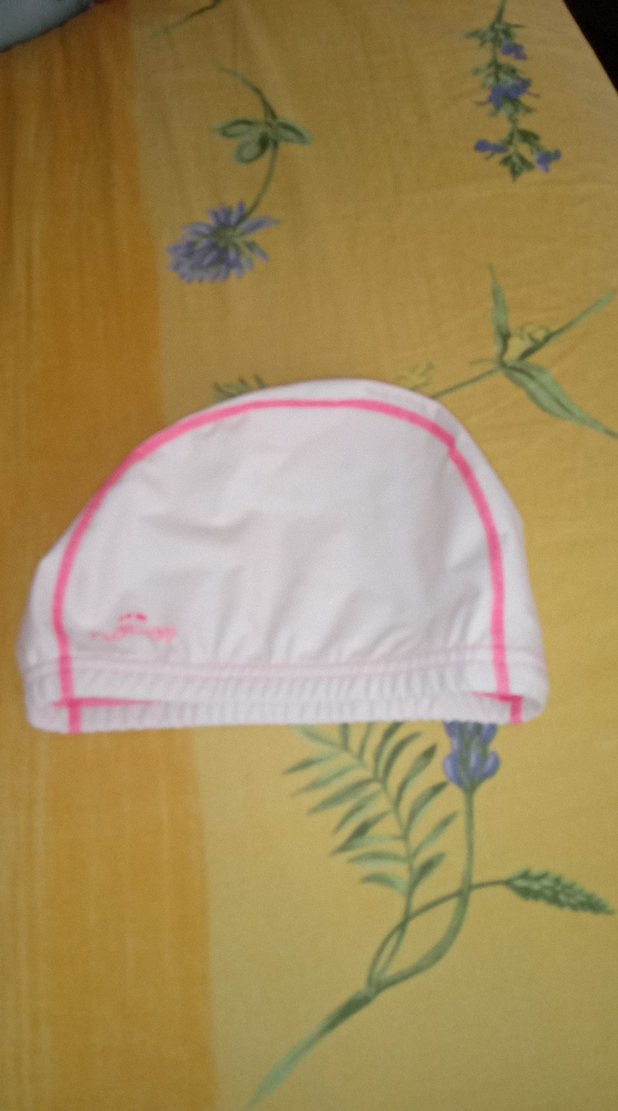 Plaj için pembe renkli detaylı beyaz çocuk yüzme bonesi. Rahat ve sade kayışlı tasarıma sahiptir. ️