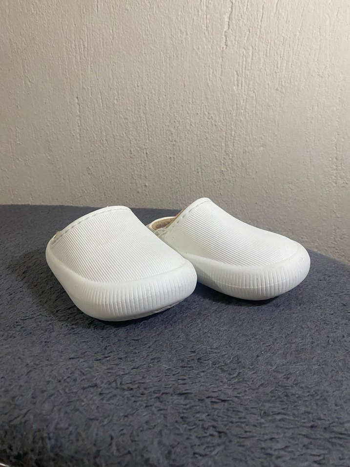 Beyaz renkte, kauçuk malzemeden yapılmış, desensiz çocukplatform terlik. Günlük kullanıma uygun, minimalist tarzda rahat bir model.