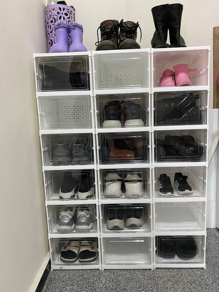 Birden fazla şeffaf bölmeli beyaz ayakkabı düzenleyici. Ayakkabıları düzenli ve görünür tutar. Sorunsuz yeni gibi. 3 parça halinde katlanır kolay paketleme yer kaplamaz