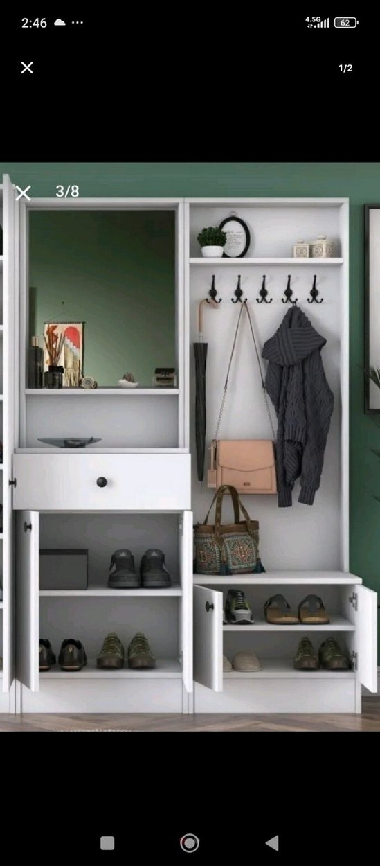 beyaz renkli, çok bölmeli dolap düzenleyici. Askılar, raflar, çekmece ve ayna içerir. Ayakkabı ve aksesuarlar için uygun. ️