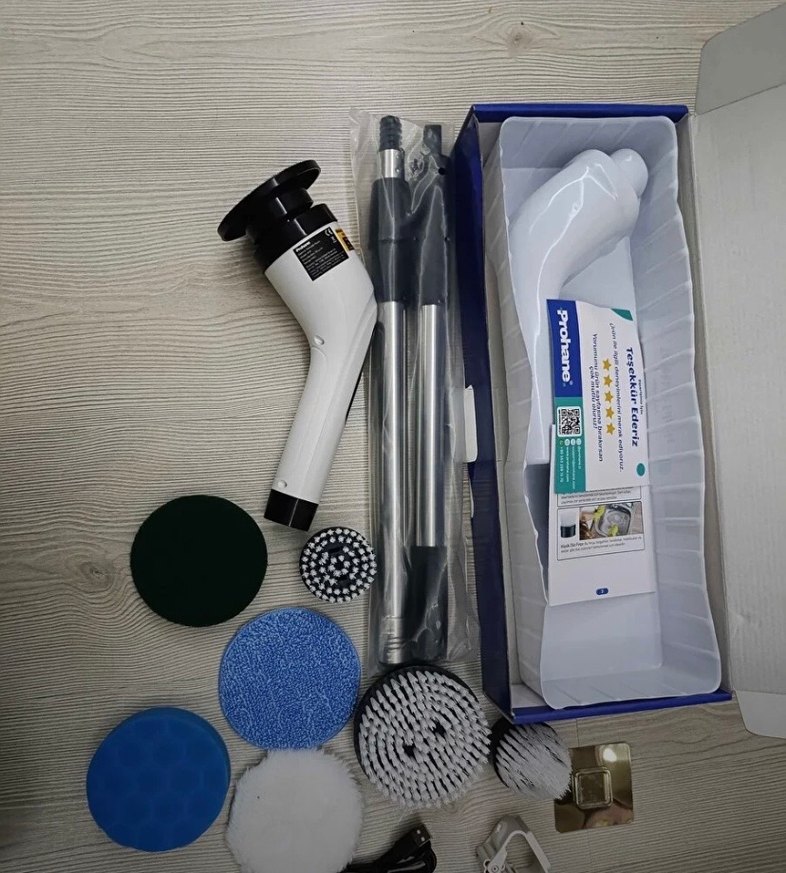 Beyaz çok fonksiyonlu elektrikli temizlik fırçası, çeşitli başlıklar ve uzatılabilir sap ile birlikte gelir. Çok yönlü temizlik için uygundur.