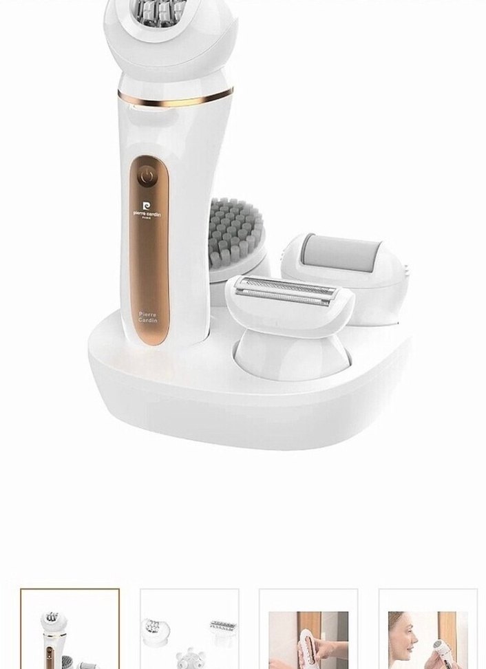 Çok fonksiyonlu beyaz epilatör seti, saç alma ve cilt bakımı için farklı başlıklarla birlikte gelir. Şarj standı dahil.
