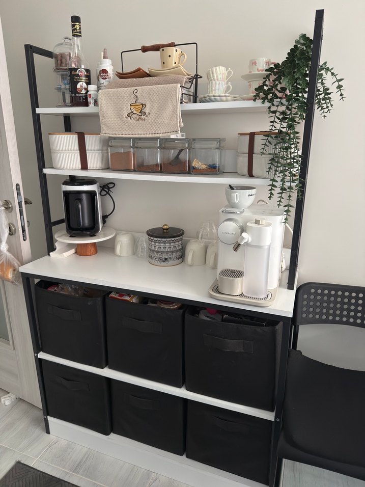 Siyah saklama kutuları ve kahve makinesi alanı bulunan beyaz çok raflı ev düzenleyici ünitesi. Mutfak veya oturma odası için uygundur. Alttaki siyah karton kutular dahil değildir ☕
