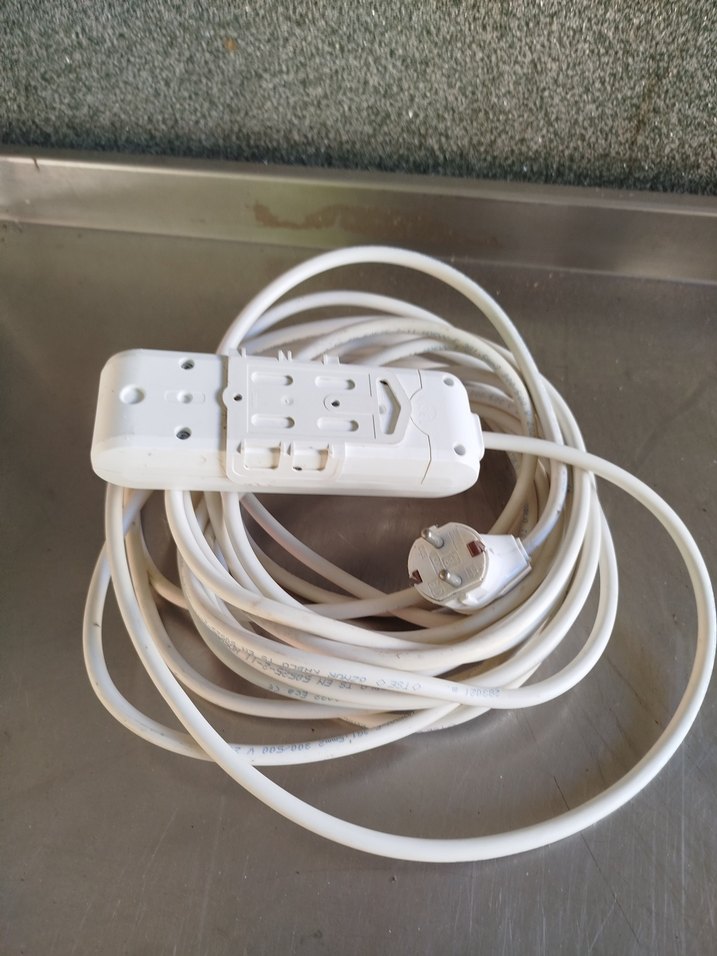 Birden fazla priz girişi ve uzun uzatma kablosu olan beyaz çoklu priz. Aynı anda birkaç cihaz bağlamak için uygundur.