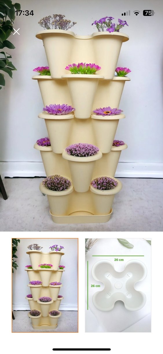 Beyaz çoklu saksı standı, küçük çiçekler için ideal, 26 cm ölçülerinde kompakt tasarım.