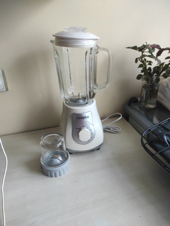 Beyaz Cookplus blender seti, büyük cam hazne ve küçük doğrayıcı aparatı ile çeşitli hızlarda çalışabilen basit bir kontrol düğmesine sahiptir. çırpıcı doğrayıcı Blender seti az kullanılmış görüldüğü gibi çalışıyor 6 parça çam Sürahi diğer aparatı da cam çok sağlıklı