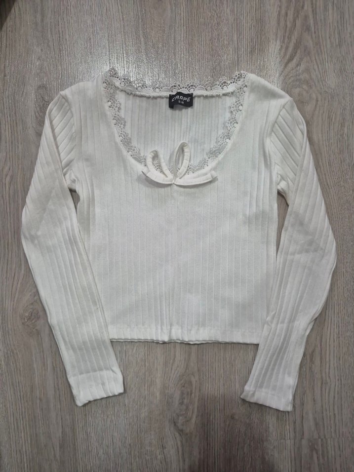 Beyaz, uzun kollu, kısa kesim ve ince örme kumaştan oluşan bu bluz, dantel detaylı yuvarlak yaka ile günlük sokak stiline uygun.