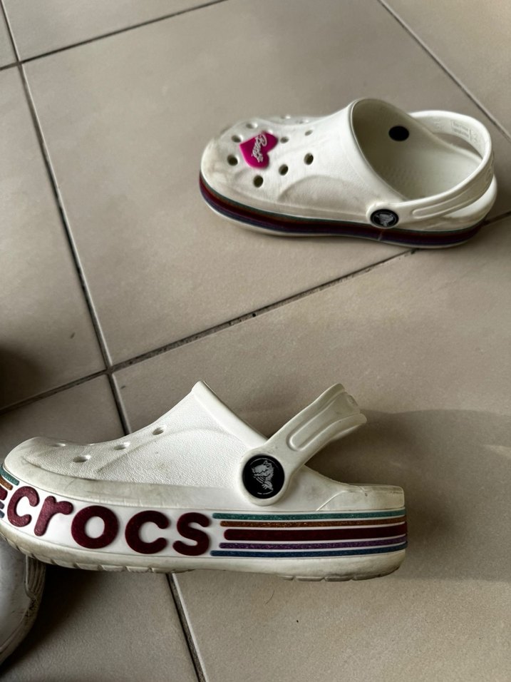 Beyaz Crocs kız terlikleri, pastel baskılı detaylar ve Velcro bantlı. Kauçuk malzemeden, trend sokak stili için uygun. c11 28/29 numara crocs terlik
