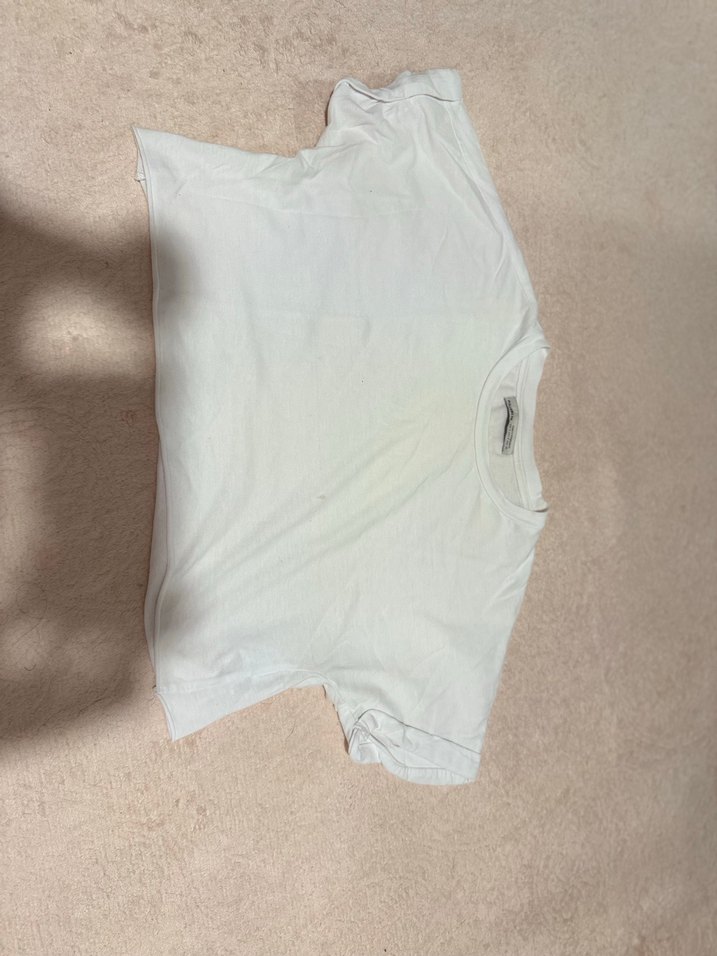 Yumuşak kumaştan, beyaz renkte ve sade tasarımlı crop. Günlük kullanım için uygundur.