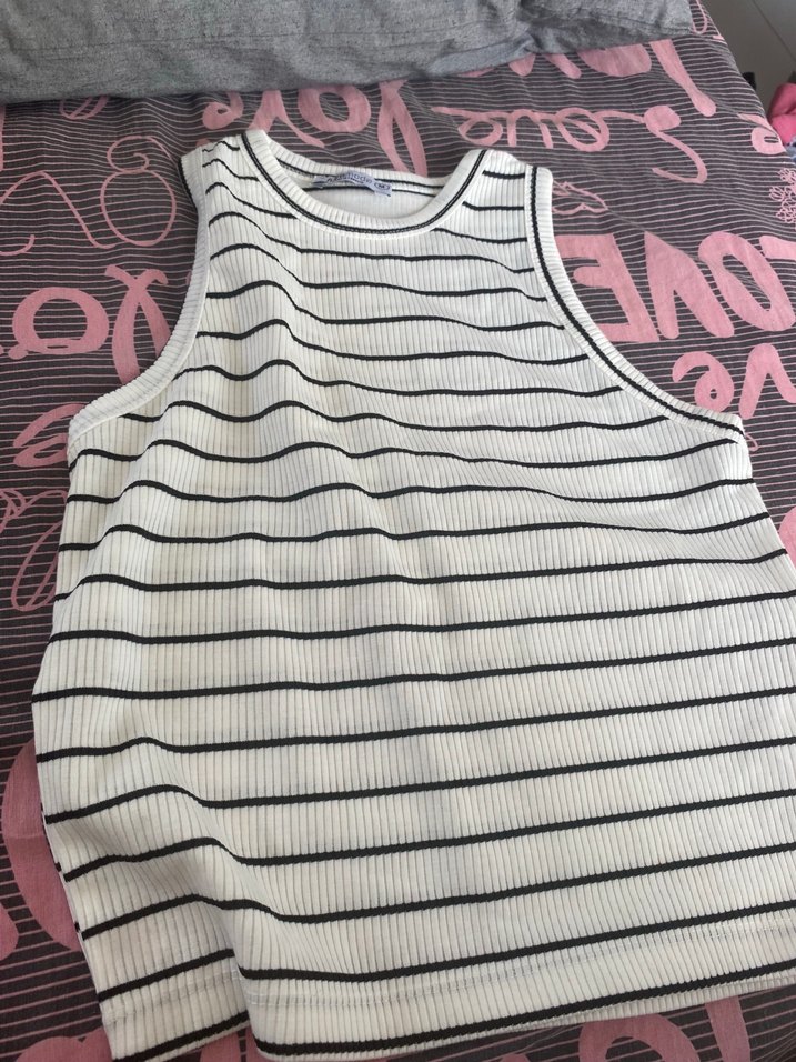 Bu kadın atlet, kolsuz ve tekne yaka tasarıma sahiptir. Fitilli örme sentetik kumaştan üretilmiş olup, beyaz zemin üzerinde gri çizgiler bulunur. Günlük rahat kullanıma uygundur.
