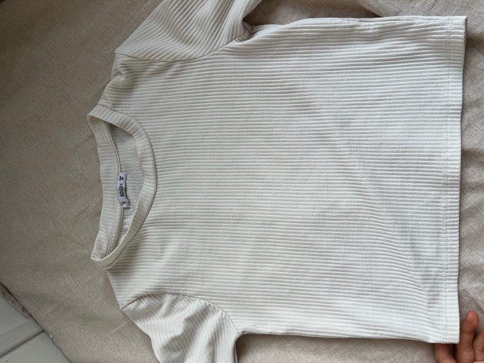 Keten kumaştan, kısa kollu ve bisiklet yaka olan beyaz hamile tişörtü. Düz renk ve pilili detaylar içerir, günlük kullanım için uygundur.