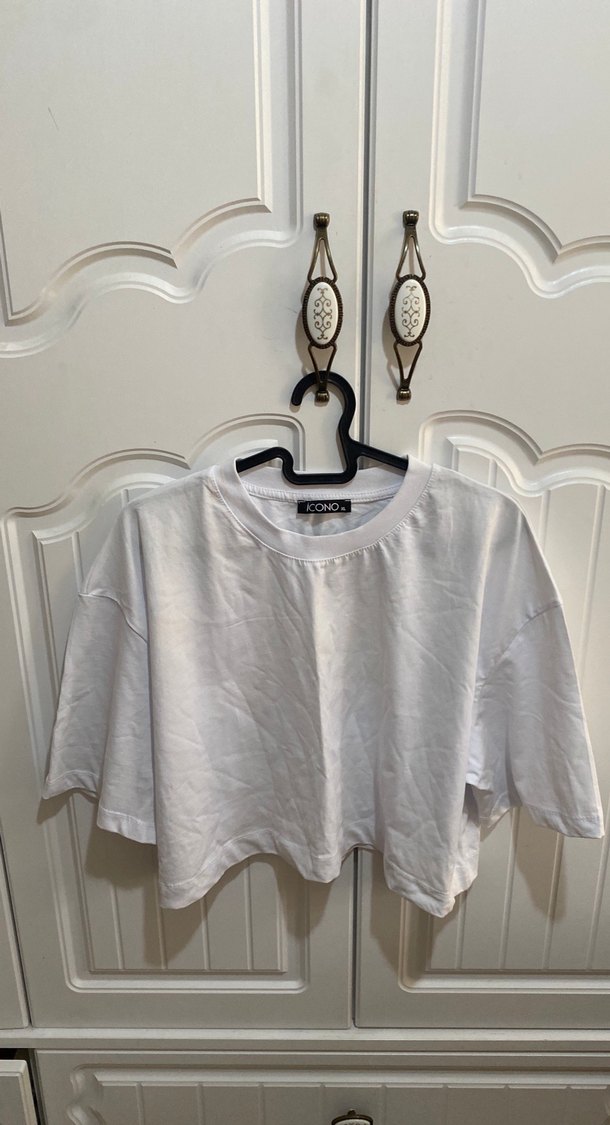 Beyaz pamuk crop top, kısa kollu ve yuvarlak yaka, günlük kullanıma uygun rahat ve minimalist tarzda.