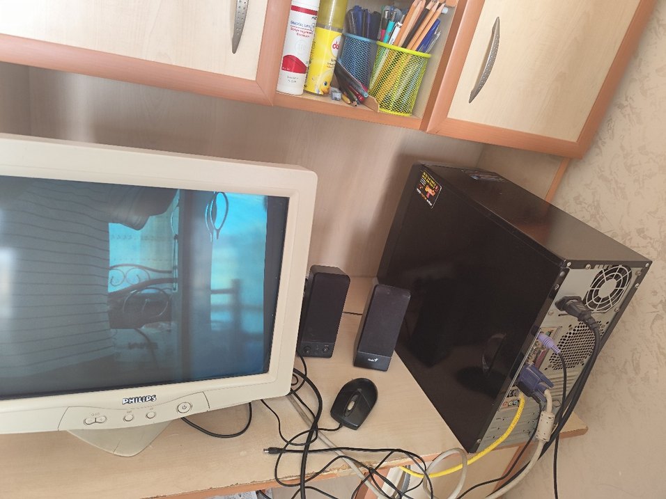 Beyaz CRT Bilgisayar, kasa, klavye, hoporlörü ve mouse