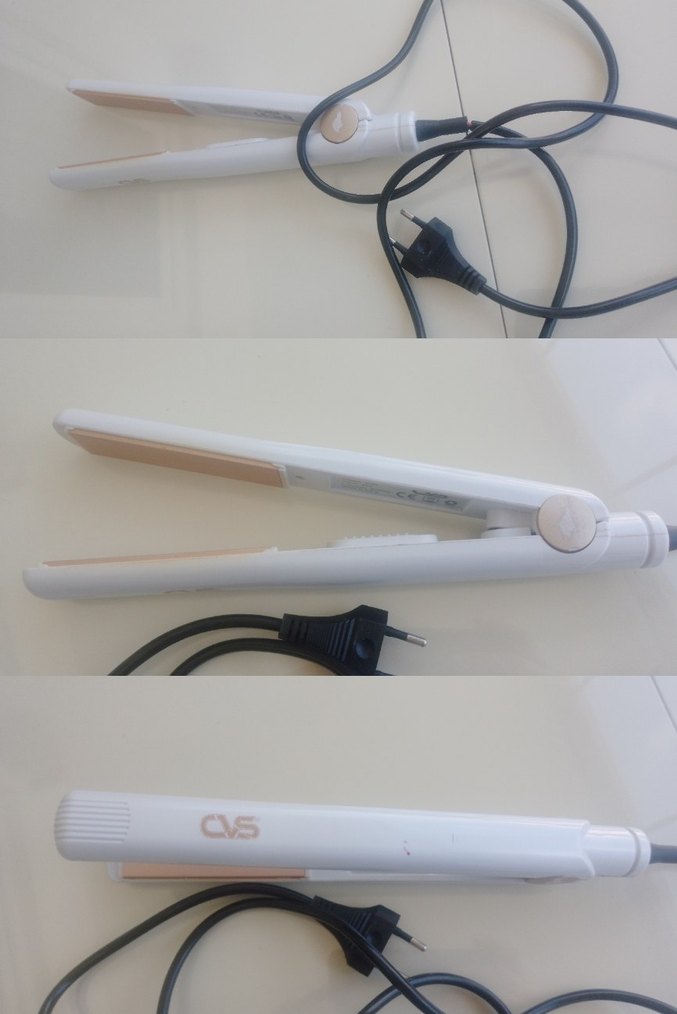 Beyaz renkli CVG saç düzleştirici, ince plakalar ve ayarlanabilir sıcaklık düğmesi ile kolay kullanım sağlar. Standart güç kablosu mevcuttur.