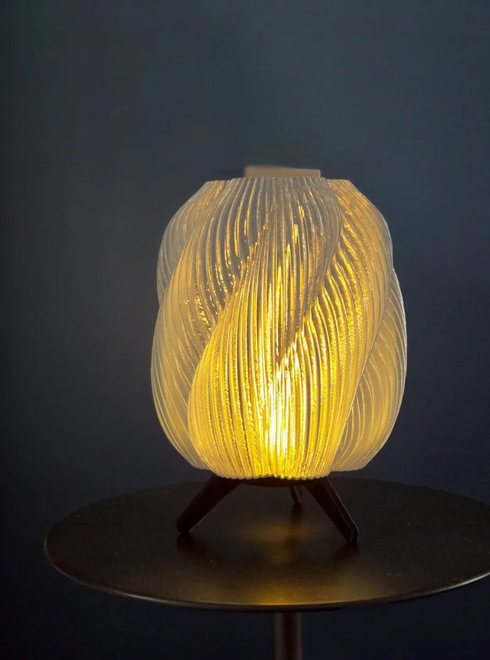 Dalgalı desenli beyaz masa lambası, sıcak ve yumuşak ışık verir, koyu renk üç ayaklı tabana sahiptir.