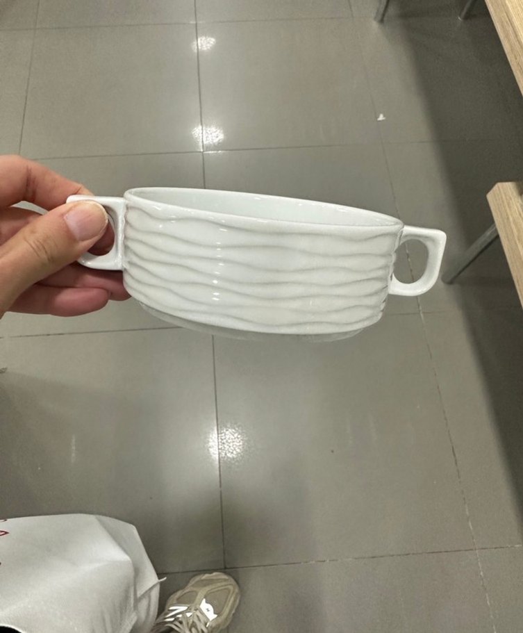 Dalgalı dokulu, iki dikdörtgen kulplu beyaz seramik kase, çorba veya atıştırmalıklar için uygun.