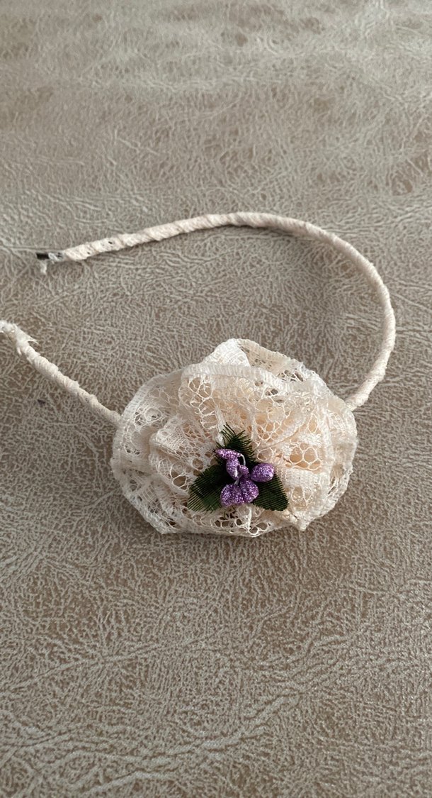 Bohem tarzda, beyaz dantelden yapılmış, pastel çiçekli ve mor çiçek detaylı çocuk taç.