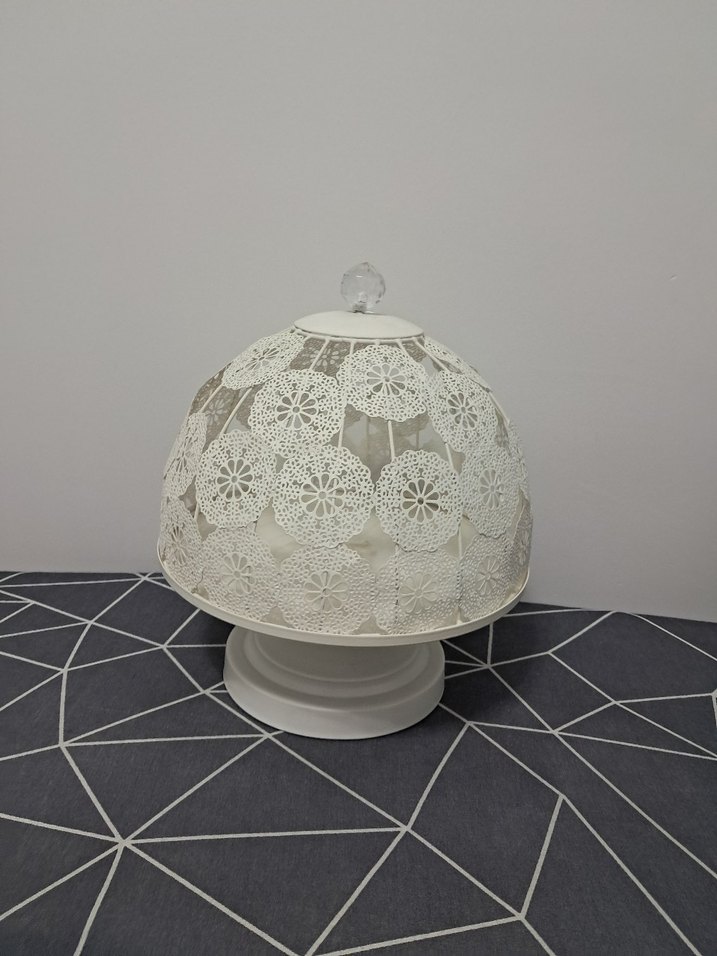 Beyaz dantel desenli şapka ve yuvarlak tabanli sunumluk.